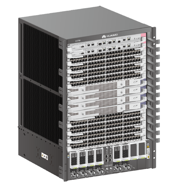 Huawei S12708 is an enterprise-level layer 3 switch launched by Huawei Technologies Co., LTD., mainly applied in data exchange and network management scenarios of enterprises and government agencies. This device adopts a modular architecture, supporting 8 service slots, with a maximum switching capacity of 60Tbps and a packet forwarding rate of 6240Mpps/9120Mpps, meeting the requirements of high-throughput data transmission.